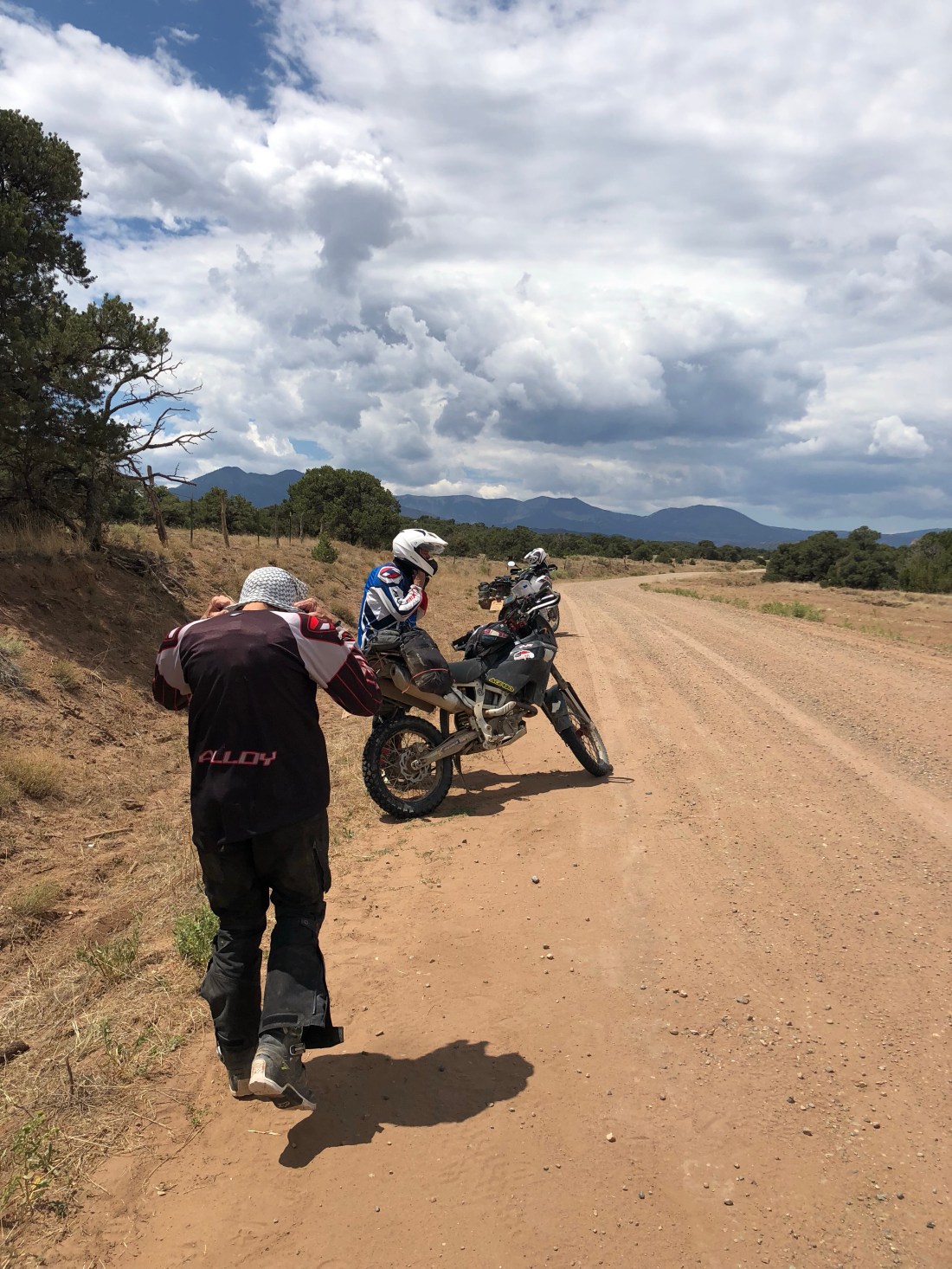 It was awesome! We got back on the bikes and headed out as a group. The day was perfect. Well, as it would enfold, the moment was perfect and the day turned to sh*t. We got to our first mountain trail that had a cattle barbed wire fence. One of the Brits held it open as I passed. We were in for a rude awakening. The trail turned into large broken rock and steep hill climbs. I felt a little more confident knowing I had some guys with me if I needed help so I rode a little harder than I typically would. We ended up getting to a fork in the trail. To the right was a hard single track and to the left was the original trail. Of course the British went right (which they would soon severely regret) and I went left. I got about 5 or so miles until I noticed the clouds getting darker and darker. Not long after, I was in the middle of a wicked thunderstorm. It began to flash flood everywhere and the temp dropped from 85 to 45 in a matter of an hour. I was prepared for the rain but not the cold. I made it to a highway and it became pretty scary. I could barely see in-front of me and lighting was striking everywhere. I found a house on the hillside that looked empty, ditched my bike under an aspen and jumped their fence to get under their awning. I stayed for about 30 minutes until it seemed like it was letting up. Turns out it wasn’t. Yet again I was in the middle of this storm on a bike. I went about a mile from that house and the road was blocked by the game warden. He said their were a couple of land slides and it’s impassible. I told him I had to go through and he said he’d let me ride down to check them out. I got to the first landslide (a bike easily could’ve made it) and not 100 yards in front of me, another landslide hit. Screw that, I turned around and started back tracking. I made it back to the game warden to find the British guys were there. They said the hard section was deadly and had to turn around. We found a town called Beulah and headed for safety. Of course, the only way there was over a mountain off road. 30 minutes later we were finally there. To add insult to injury, the roads were covered in mud in town and the first stop sign I came to, I hit the front brake and completely wrecked. I hit the ground and the bike slid across the street. Wreck #3. My gear did its job and the Brits helped get my bike back up. I was pissed, wet, cold and defeated. Of course, the only hotel in town was closed so we had to ride 20 miles to Pueblo, Co. we made it around 7 and snagged a hotel. Best shower and bed of my life. I slept in and headed to Denver the next day for some repairs. I’ll be in Denver until Thursday morning where my dad will be joining me for the next few days. Huge shout out to Ben Thomas and his roommate Clayton for giving me a place to stay and work on my bike!