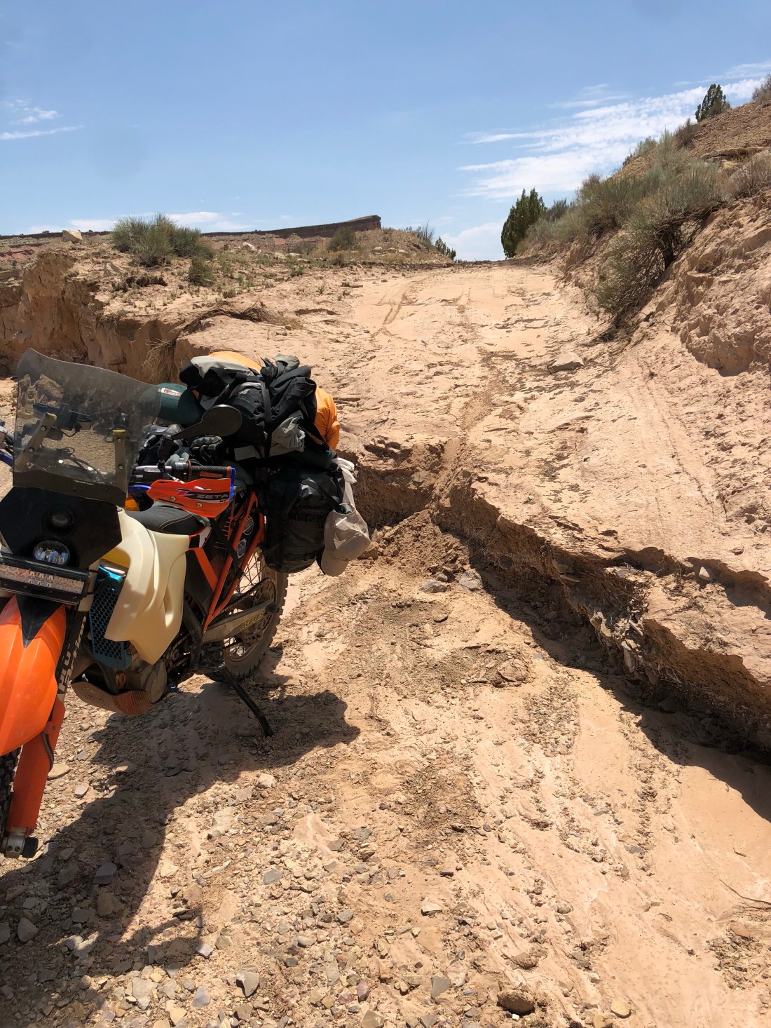 The trail took me through about 20 miles of nothing but sand. This is where things got a little scary. It’s 108 degrees and not a cloud in sight. My bike was starting to overheat because of the sand and my Garmin decided to overheat and shut off. On top of all of that, half way down the trail a large storm had previously washed out the sand road.